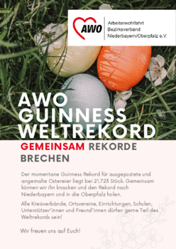Mit 21.800 ausgepusteten Eiern eine über 1.051 Kilometer lange Schlange zu legen und damit einen neuen Weltrekord aufstellen, soweit das Ziel des AWO Bezirksverbands Niederbayern /Oberpfalz, mit seinen Kreisverbänden, Ortsvereinen und Einrichtungen.